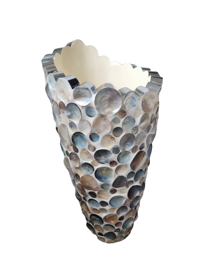 Eine bunte Komination von einzigartige Muscheln in Vasen und Bowls